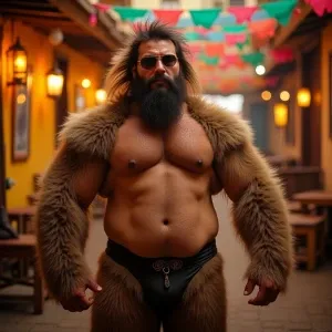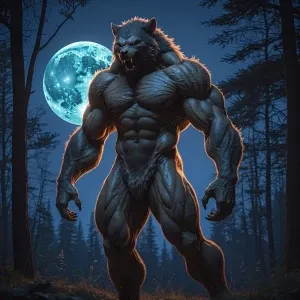«In a moonlit forest clearing, visualize a towering lycan showing...»