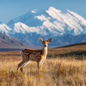 «Freckles the baby fawn stands in the vast tundra meadow with Mou...»