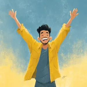 «Create an illustration of a joyful young man with his arms raise...»