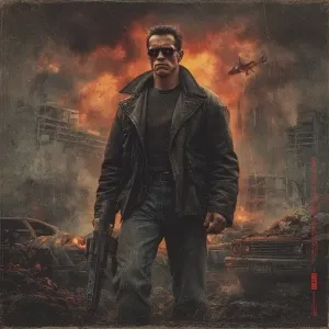 «T-800 Spider-Man, apocalyptic futuristic background»