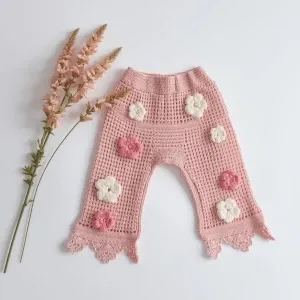 «Create a flat lay showcasing a delicately hand-crocheted pink wi...»