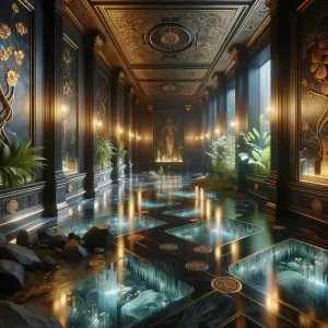 «Basement – The Hidden Temple Lounge: Beneath the mansion lies a...»
