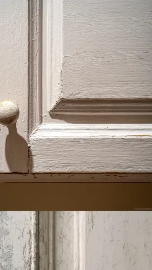 «Photograph a single kitchen cabinet door close-up, showing sligh...»