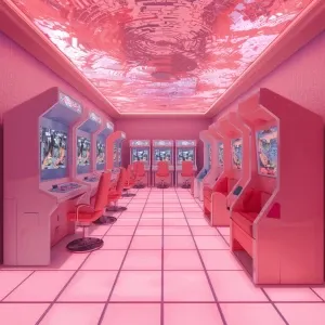 «Step into the futuristic oasis of Lake Prism Arcade. The floor g...»