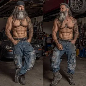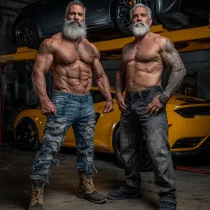 «The image depicts a muscular,bodybuilder Italian man gray hair a...»