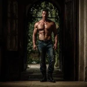 «The image depicts a muscular,bodybuilder Italian man standing in...»