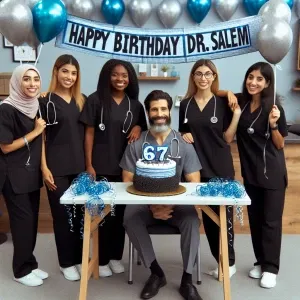 «Create an image of six employees at an Injury Rehab Clinic celeb...»