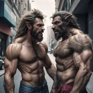 «Muscle hairy lycan guy showing offA homeless man, looking at str...»