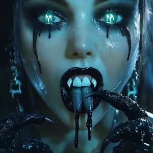 «A hyper-realistic gothic digital painting of a vampire woman. He...»