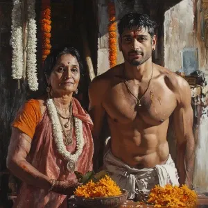 «Create a realism painting of a muscular, perspiring man engaging...»