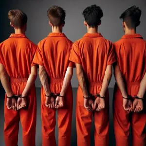 «4 Caucasian male teenagers, wearing orange jumpsuits, walk in li...»