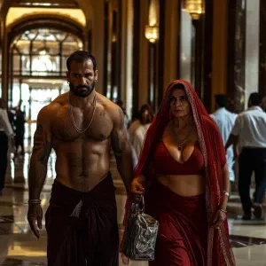 «A sweaty beefy man walking with his 54 year old kashmiri mother...»