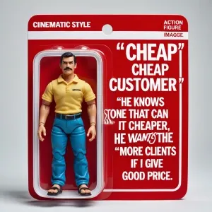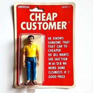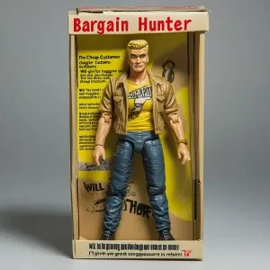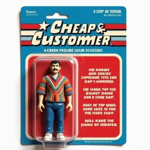 «Create a product packaging for an action figure called "Cheap Cu...»