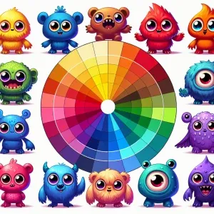 «A color wheel of happy cute toy monster toys, each represents th...»