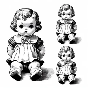 «black and white drawing of a vintage style Kewpie doll. She is p...»