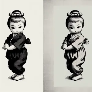 «Create a black and white ink drawing of a vintage Kewpie doll fa...»
