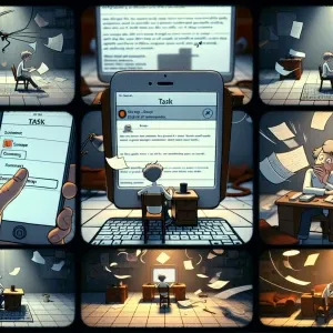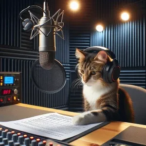 «A domestic cat wearing headphones, intently reading an open lett...»