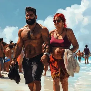 «Realism art style ,a muscular beefy sweaty man walking on bahama...»