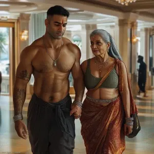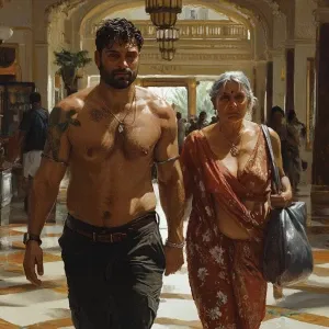 «Realism Digital art HD.A sweaty man walking with his mother in...»