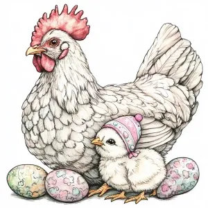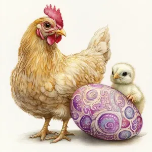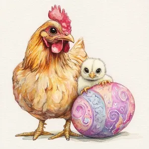 «A hen and a chick, depicted in a detailed watercolor style. The...»