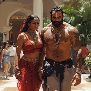«Fantasy painting.A sweaty beefy man walking with his 54 year old...»