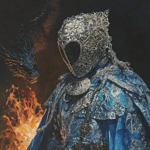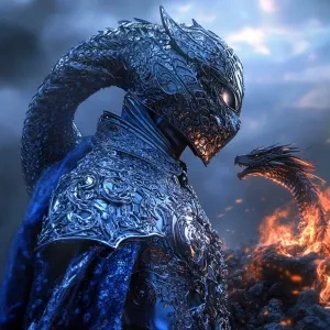 «A figure draped in ornate, blue chrome armor with intricate silv...»