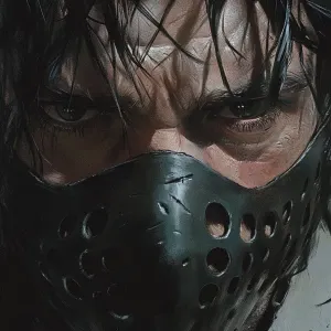 «A close-up illustration of a man's face wearing a dark, metallic...»