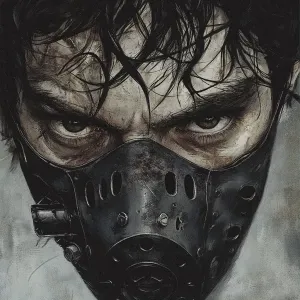 «A close-up illustration of a man's face wearing a dark, metallic...»