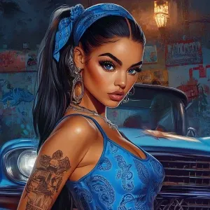 «a modern Chicano lowrider art style. It features a confident pre...»