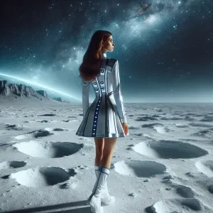 «space girl, rear view , beautiful, standing on a white moon-type...»