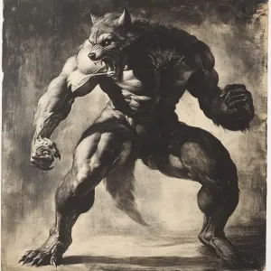 «A muscular lycanthrope (werewolf) in a dynamic pose, prominently...»