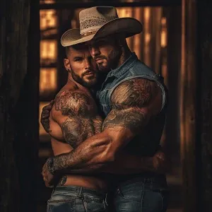 «The image features two muscular men dressed as firefighters, joy...»