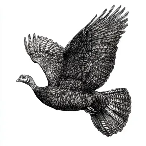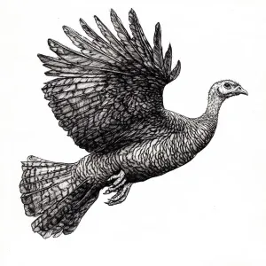 «Pen and ink drawing of a turkey flying, the view is from the sid...»