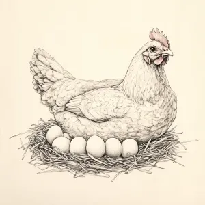 «Pen and ink chicken laying on a bed of straw containing eggs und...»