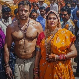 «Realism art,a man(muscular beefy sweaty gujarati employer)standi...»