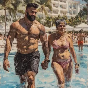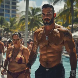 «Realism,a man muscular beefy sweaty walking with a woman(his 50...»