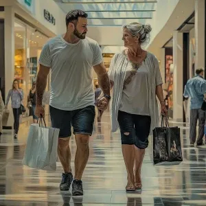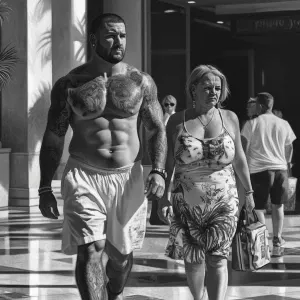 «(Realism),a man(muscular sweaty beefy) walking with woman(his 5...»