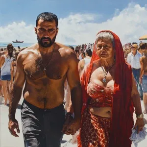 «(Realism art),a man(muscular sweaty beefy) walking with woman(hi...»