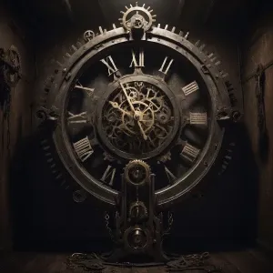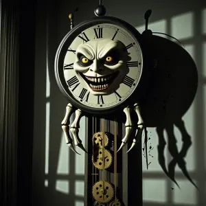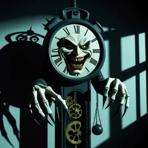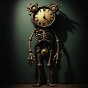 «Visualize an eerie, anthropomorphic clock standing in a shadowy...»