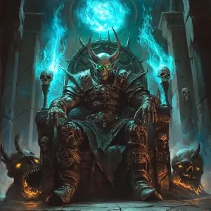 «goblin warrior sitting on a throne, with a creature by his side....»