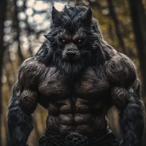 «A muscular lycanthrope with dense fur, posed to display a full-b...»