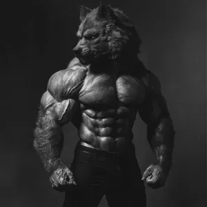 «Lycan hairymuscles showing off full necked col view»