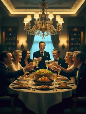 «A lavish dining room where a wealthy family celebrates, laughing...»
