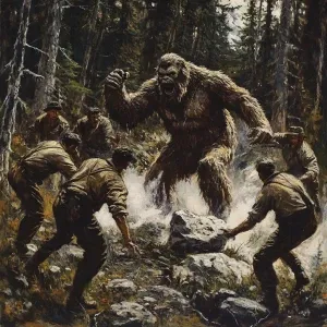 «Six men pursue a humanoid sasquatch, approximately 7-8 feet tall...»