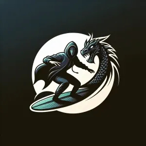 «Create a logo that depicts a cloaked individual surfing atop a d...»