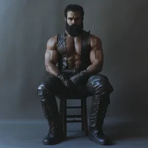 «30 years old jet black hair trimmed beard bodybuilder, artist wi...»