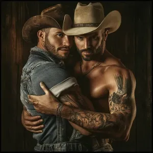«Two men, both with visible tattoos and wearing biker-style cloth...»