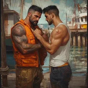 «The image depicts two men on a dock, surrounded by a tranquil co...»