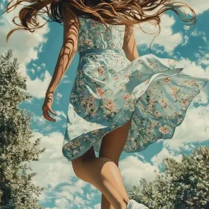 «Design an image featuring an elegant tall woman with flowing wav...»