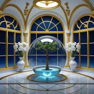 «A c ceiling, large arched windows with intricate gold designs, a...»